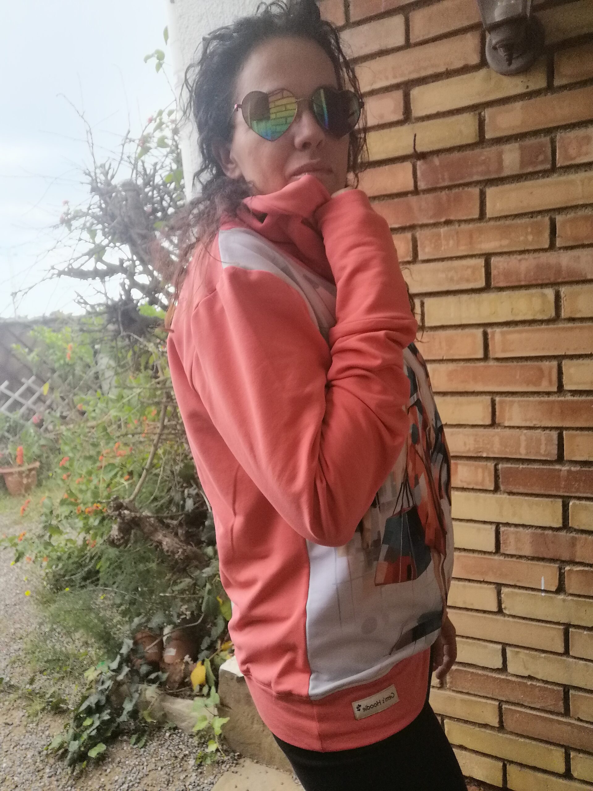 Sudadera con cuello, hecha a mano, de mujer con dibujo delantero y espalda lisa color coral.