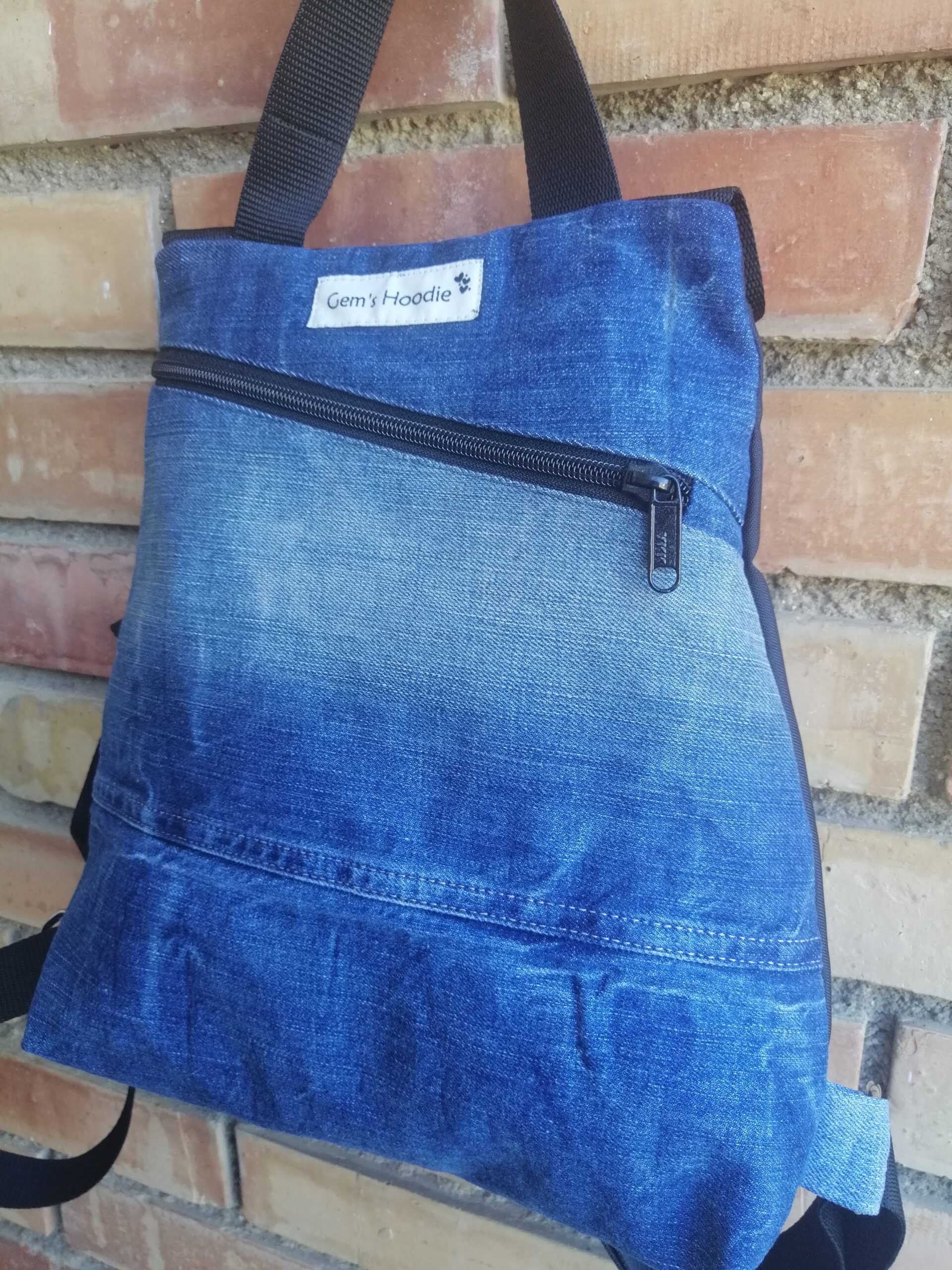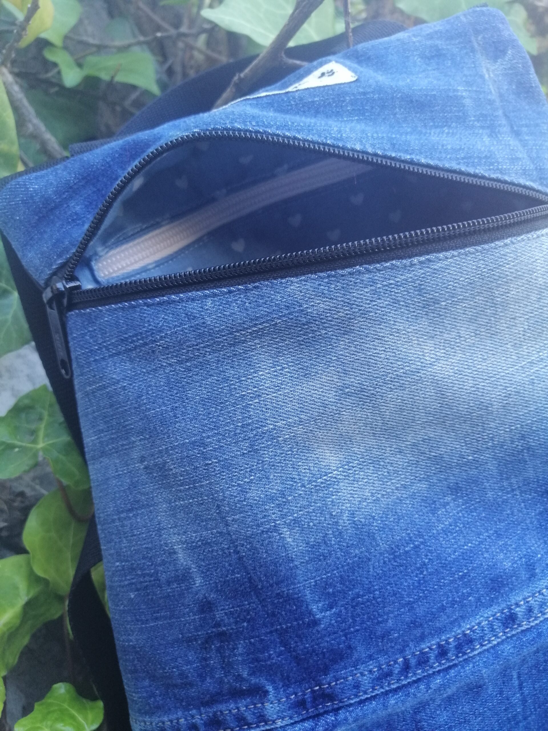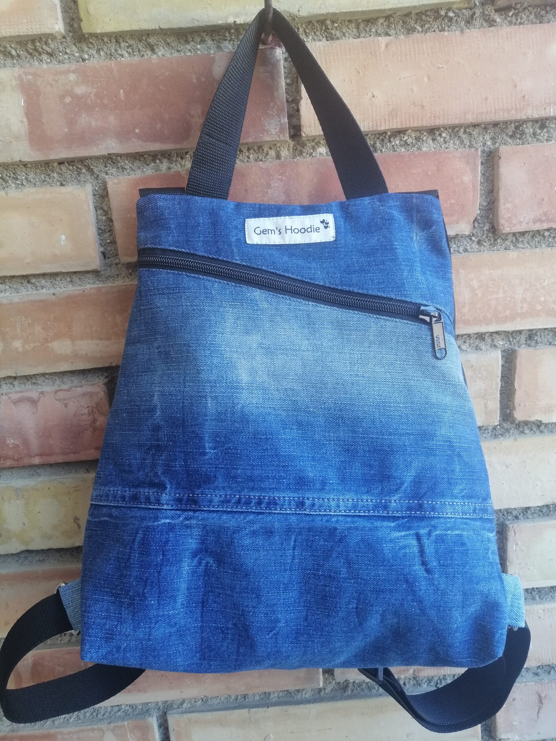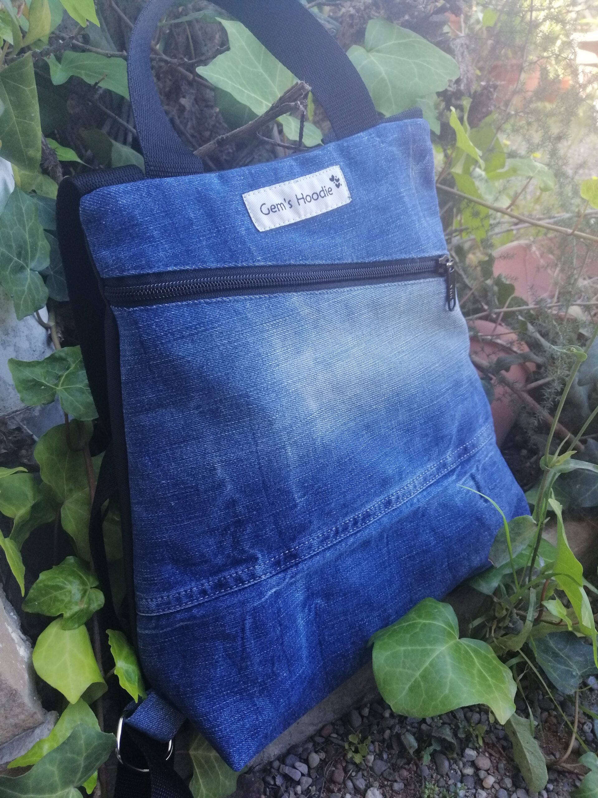Está hecha a mano y confeccionada a partir de vaqueros reciclados, transformando prendas en desuso en un accesorio moderno, resistente y lleno de carácter.