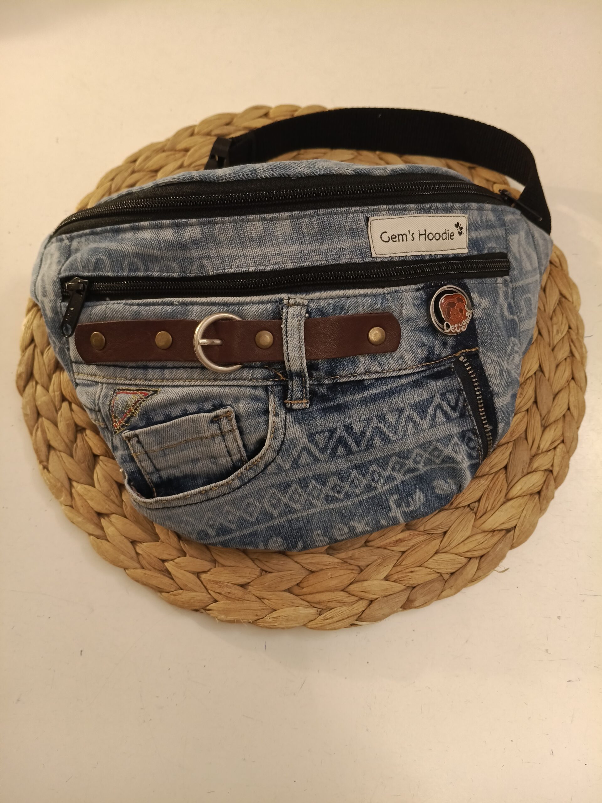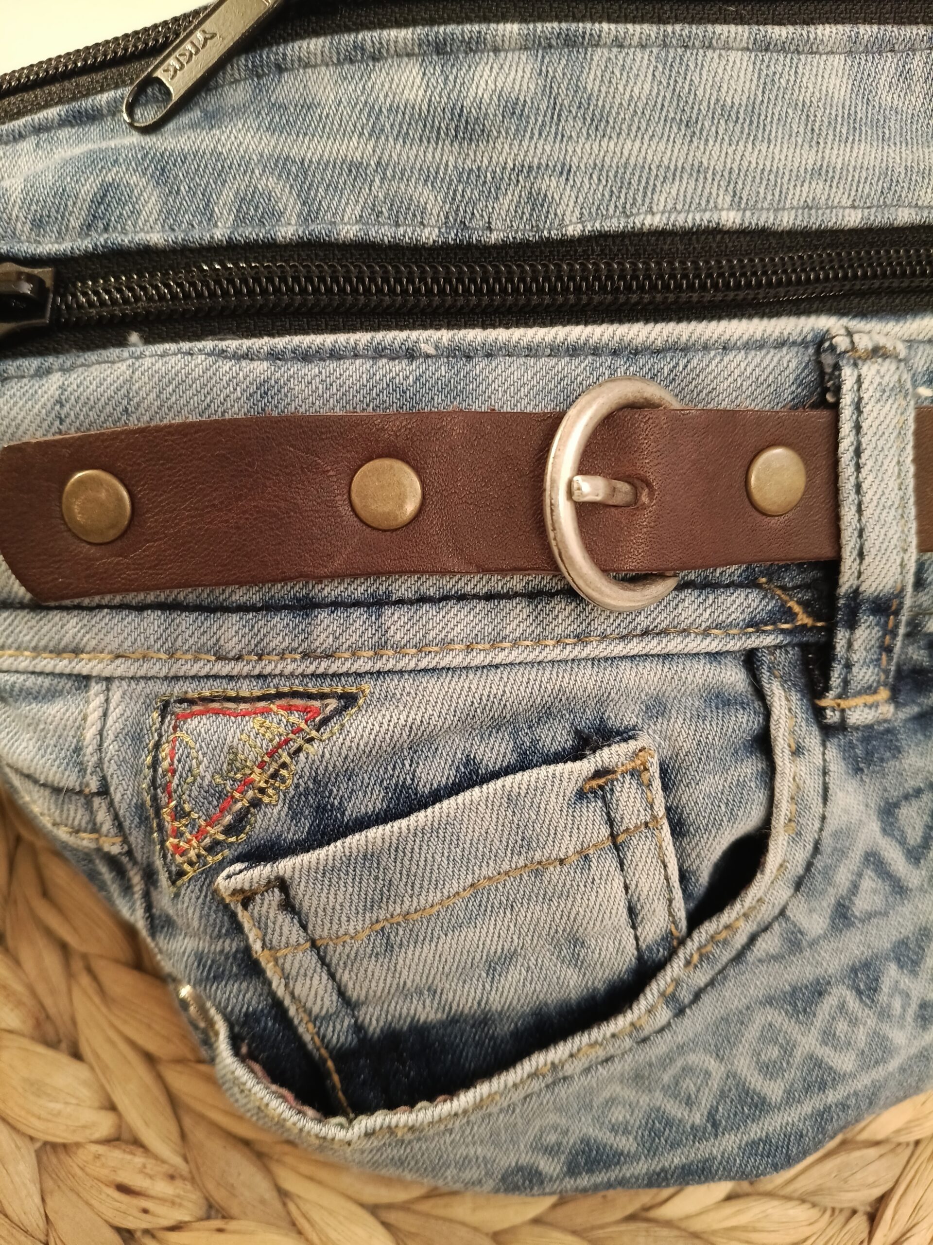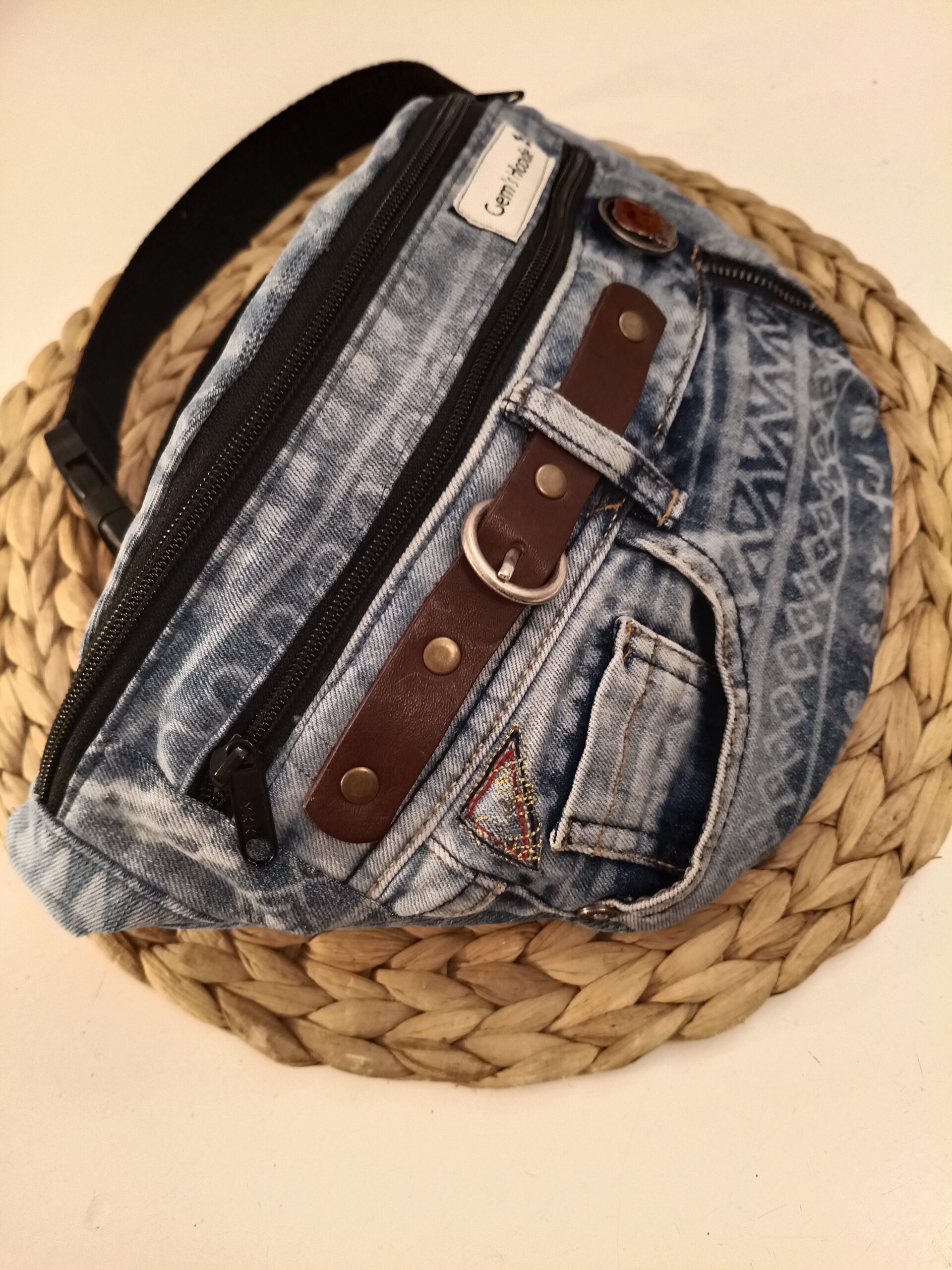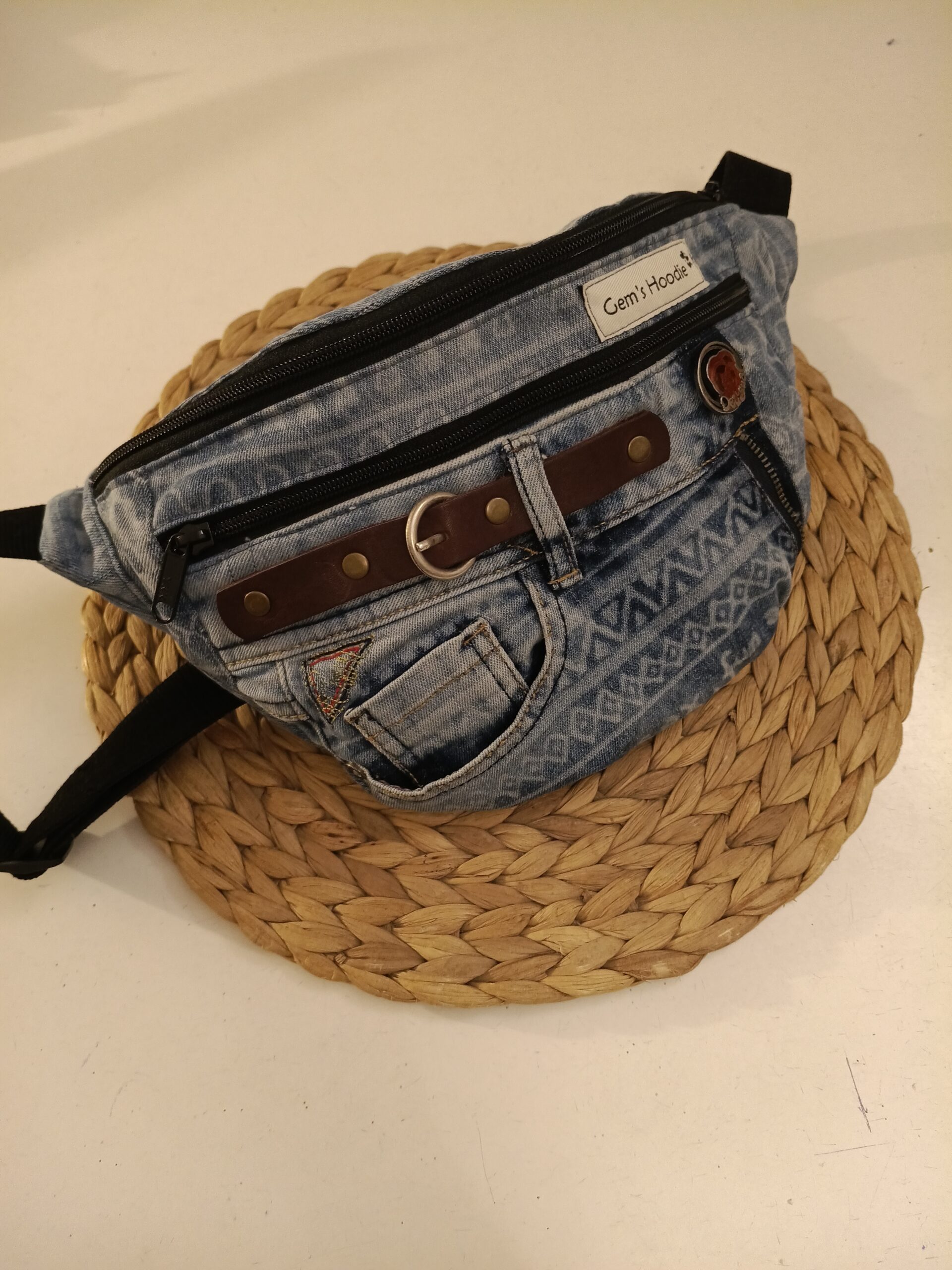 Riñonera hecha a mano, a partir de vaqueros reciclados con dos cremalleras delanteras y un bolsillo, del mismo tejano,en la espalda.