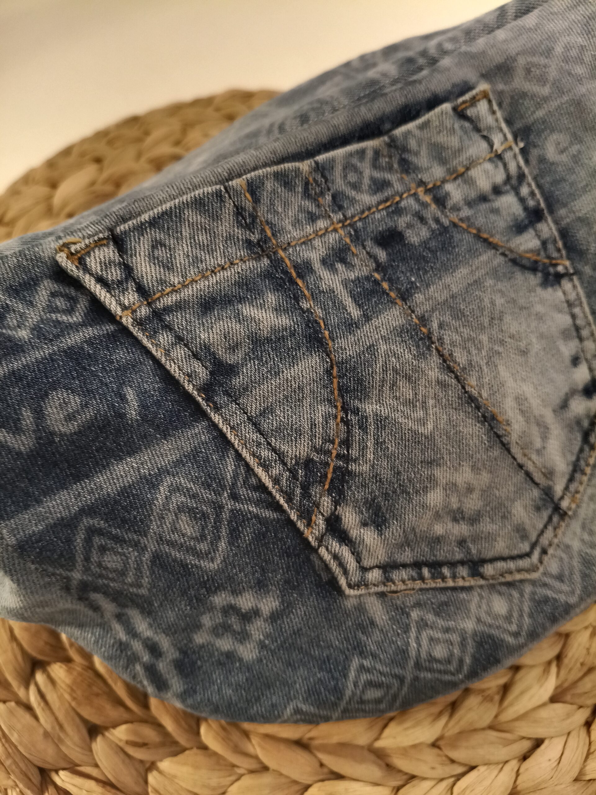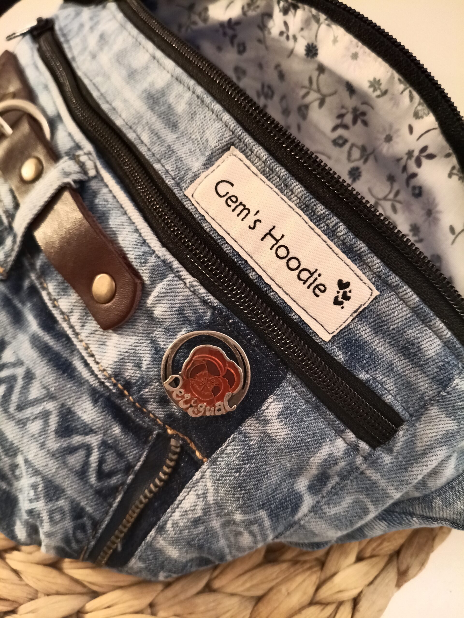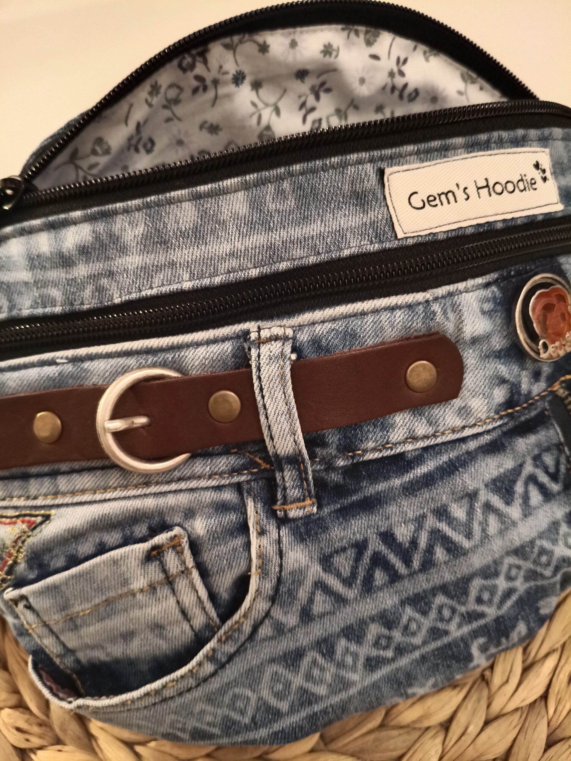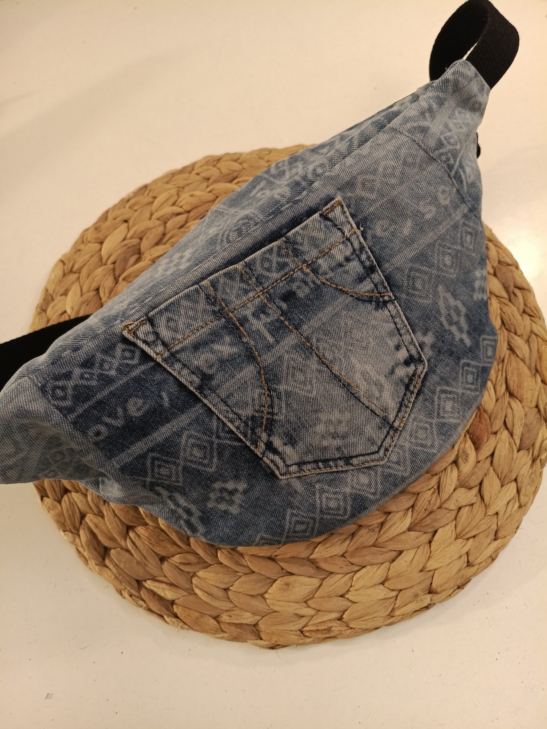 Riñonera hecha a mano, a partir de vaqueros reciclados con dos cremalleras delanteras y un bolsillo, del mismo tejano,en la espalda.